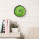 Cette horloge murale ronde présente une belle fractale en spirale monochromatique dans les tons verts et les chiffres noirs.
