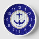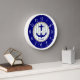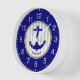 Cette horloge présente un design nautique avec des chiffres blancs, des rayures grises, un ancrage bleu marine et un nom de bateau personnalisable dans un cadre de corde ronde.