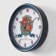Knights Style shield monogram letter A art name simple wall clock in shades of red, golden yellow, blue white and grey. Personalize with your child's own name and name meaning for a personalized touch to your child's menacom or nursery, this example is for names starting with the letter A. Currently reads Archer Bowman Responsive, practical and strong. Idéal for a venin to a new baby boy, for a christening, baby naming ou baby shower. Unique shield drawing, graphic art, name research, wording and design by Sarah Trett. www.sarahtrett.com for www.mylittleeden.com
