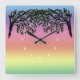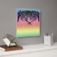 Arbre, en noir avec une teinte de vert, tendant des coins supérieurs sur les chiffres blancs de la face de l'horloge. L'Arrière - plan est rayé couleurs arc-en-ciel ombrage à travers le bleu violet, rose, rouge, orange, jaune et vert, de haut en bas.