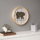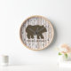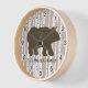 Un ours brun placé sur les bouleaux avec une palette de couleurs neutres. Cette horloge rustique aurait l'air superbe dans n'importe quel cabine, loger chez soi, ou salle à thème rustique.