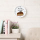 This fun wall clock says "It's cake o'clock !" The picture shows a graphic of a chocolate cake with buttercream and a chocolate frosting. A delicious treat for a cake lover or a home baker.