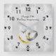 Le 25e anniversaire du Mariage d'argent est une occasion spéciale. Cette élégante couleur argentée et design attrayant fait le cadeau idéal pour le couple d'anniversaire. Couleur argentée texturée, marbre comme arrière - plan avec deux anneaux, chiffres arabes noirs marquant les heures, lignes noires marquant les minutes décorées de 12 coeurs noirs. Cliquez sur le bouton "CUSTOMISER l'informatique" pour changer les noms, et choisissez vos polices préférées.