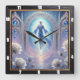 Cette horloge murale carré présente une figure mystique en robes bleues coulantes qui montent à travers une arcade ornée et joliment décorée, entourée d'une brillante et délicate bulle. Des roses blanches luxuriantes encadrent la scène, dressées contre un ciel doux et éthérée, évoquant un sentiment de transcendance spirituelle et de beauté sereine.