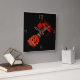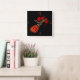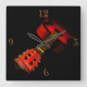A clock design that shows a red acoustic guitar. The photograph is taken diagonal, up close to the head of the guitar, located at the bottom left, going upwards, following the doigts board, towards the vague body of the guitar at the top right part of the picture. Only the four main hour numbers (UI 12, 3, 6, 9) are displayed in golden/orange color. Les Background sont noirs, les Red Instrument Really out !