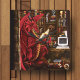 Dragon rouge assis dans sa tanière d'ordinateur lisant un livre. Derrière, il y a du matériel de baladodiffusion et un ordinateur sur son bureau