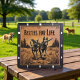 This striking square wall clock features a dimensional illustration of two dogs (possibly cattle dogs/dingos) running toward the viewer through an arid, grassy field. The entire design is rendered in rich brown, black, and burnt orange tones, strongly suggesting a deep carved relief or Engraved Wood Look. The dogs are highly detailed in a stylized, almost graphic manner. They are surrounded by clumps of long, textured dry grass and small rocks in the foreground. The background shows stylized pine trees under a burnt orange sky. The large, three-dimensional embossed text "BESTIES FOR LIFE" is carved across the top. The clock face features a simple clock face border with large, white, numbered tick marks (1 to 12) integrated into the outer frame. The artwork is surrounded by a thick, dark brown decorative border that resembles a black wood frame.