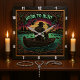 Illustration puissante d'un chasseur sur un lac sous la couverture d'un ciel sombre, à outils, de couleur néon. Il est dans un petit bateau, entouré de plusieurs canards. Les montagnes et un oiseau solitaire au-dessus ajoutent à l'atmosphère générale d'une poursuite solitaire et déterminée. L'expression "NÉE À LA CHASSE" apparaît en haut de l'oeuvre.