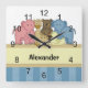Customisez cette image douce farcie d'animaux imprimée sur une horloge murale, idéale pour la pépinière de bébé. Il suffit de modifier le texte de nom personnalisé dans l'éditeur Zazzle facile. Créé en partie avec des graphiques de Scrappin Doodles sur scrappindoodles.com,