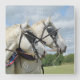 A clock with Roman numerals portrait of a matching pair of Percheron grey draught horses at a ploughing competition, wearing harnesses with blue and red collars and blinkers, against a backdrop of fields and blue sky with fluffy clouds. photographe par ruralfrance.