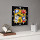 Cette horloge unique comporte un collage lumineux et coloré de signalisation jaune, rouge, et blanche, y compris un signe d'arrêt et un signe de limitation de vitesse. L'image carrée est encadrée en or, et placée sur un arrière - plan noir dramatique. Les nombres blancs rendent l'horloge facile à lire.