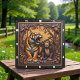 This striking square wall clock features a highly dimensional illustration of a large tiger roaring and a monkey smiling seated right next to it. The entire design is rendered in rich orange and dark brown wood tones, strongly suggesting a deep carved relief or Engraved Wood Look. The tiger has textured stripes and the monkey is relaxed on the ground, creating a contrast in expressions. They are framed by dark, gnarled tree branches and stylized leaves carved into the perimeter. The carving style gives the entire image a strong three-dimensional, sculpted quality against the pale orange background. The prominent, three-dimensional embossed text "BESTIES FOR LIFE" is omitted from this specific design. The clock face features a simple clock face border with large, white, numbered tick marks (1 to 12) integrated into the outer frame. The artwork is surrounded by a thick, dark brown decorative border that resembles a black wood frame.