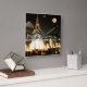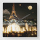 La vue classique du Palais de Chaillot la nuit. La tour se dresse derrière des fontaines illuminées, tandis qu'une lune massive domine.