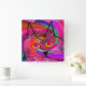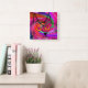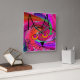 Whimsical Cat Art Clock, artist drawn cat face with big eyes on a background of multiple shads of pink, purple, orange et vert tones.