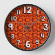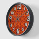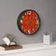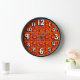 Cette horloge murale a un design moderne du milieu du siècle composé de rectangles arrondis marron connectés ensemble sur un fond orange.