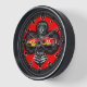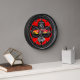 L'horloge murale élégante et personnalisable pour votre maison ou bureau. Dispose d'un motif de damier élégant en forme de trèfle déformé avec centre de course, drapeaux ci-dessous, et compteur de vitesse avec volant au-dessus. Bon appétit !