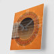 Un gros plan d'une guitare classique ou espagnole avec une rosette décorative autour du trou du son sur une horloge aux chiffres romains blancs. Disponible en continu ou en carré.