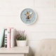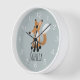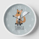 Cette horloge moderne de crèche pour bébé présente un dessin animé de renard boisé mignon. Ce joli design branché dispose également d'un endroit où vous pouvez ajouter le nom de votre fille. Le design faunique neutre pour les hommes et les femmes pour la chambre ou la petite garderie de votre enfant.