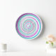 Cette horloge sans chiffres présente un design en spirale abstrait en 3 couleurs : blanc, violet et turquoise.