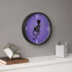 Horloge élégante murale de chat avec une belle illustration d'un chatte noir méchant gracieux avec des yeux brillants sur un arrière - plan violet texturé grunge. Cette horloge de chat noir fera un grand cadeau pour l'amoureux des chats. Il s'ajoutera également à votre décor d'Halloween, puisque les chattes noires sont l'un des symboles de ces vacances.