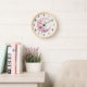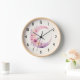 Une horloge avec une belle illustration représentant une lune rose et violette molle. De jolis fleurs sauvages roses et jaunes ornent ce corps céleste.