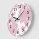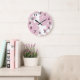 Des horloges aux murs damassés roses avec un motif damassé sur la face de l'horloge dans ce décor décoratif de mur de poutres en poutres décoratives design pour votre cuisine, salle de bains, ou n'importe quelle chambre dans votre maison que vous voulez ajouter des couleurs rose et blanc.