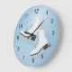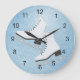 Horloge murale de conception de patins de glace avec une paire de patins de glace blanche contre un arrière - plan graphique de glace bleue.