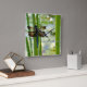 Cette belle photo de libellule a été prise au Jardin botanique de Grand Junction, Colorado. La libellule repose sur une grande lame d'herbe avec ses ailes étendues. Son corps est bleu et ses ailes translucides sont brun foncé à la base et blanc à la pointe. Chaque aile a également une petite bande noire sur le bord supérieur vers la pointe. Il y a plusieurs lames d'herbe verte derrière la libellule et l'arrière - plan de la photographie est plein d'eau pétillante reflétant le soleil.