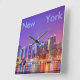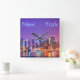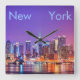 Une horloge murale carré avec l'horizon éclairé de NYC suivie du texte.