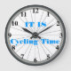 Une vue latérale d'une roue de vélo constitue la base de cette horloge murale, avec les mots "It is Cycling Time" écrit au centre. Vous pouvez customiser ces mots.