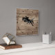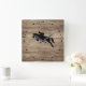 Une belle horloge murale à thème équestre présente une silhouette de cavalier et cheval sur l'arrière - plan en planche de bois.