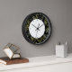 Cette horloge murale comporte des parties d'une carte à circuit imprimé intégrée avec des composants électroniques, principalement des résistances et des condensateurs, étiquetés en jaune vif à la surface avec d'autres composants, contre un arrière - plan noir derrière et autour de la face de l'horloge. Il y a de l'espace dans le centre pour votre nom ou message.