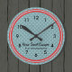 Cette horloge murale alimentée par batterie est conçue pour être une touche de décoration élégante à n'importe quel RV maison, remorque de voyage ou chalet de vacances et n'a pas besoin d'une source électrique. Conçu dans un style rétro motif dans les tons rouge et turquoise et prêt pour votre propre texte personnalisé. Voir beaucoup d'éléments de coordination à Camp_and_Cottage à Zazzle.