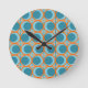 Cette horloge murale a un design moderne du milieu du siècle des cercles orange ouverts avec des cercles turquoises solides qui traversent le motif avec des lignes verticales turquoises et des lignes horizontales orange sur un champ de turquoise.