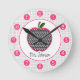 A clock for teachers featuring an illustration of a houndstooth apple Personalize with your name under apple. Clock feobjets white numbers on pink dots.