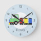 This cute kids clock design fea colorful locomotive train cartoon pastel blue, and can be personalized with your baby's name. The perfect whimsical design for your kids room or your baby nursery !