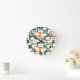 Cette horloge murale présente un design moderne du milieu du siècle avec des rectangles déchiquetés avec des trous blancs dans les tons turquoises et orange.