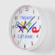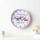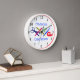 Il s'agit d'une horloge blanche avec une bordure rouge et des chiffres noirs, décorée d'outils d'artisanat (ciseaux, stylo, pinceau d'artiste, porte-ruban adhésif et clips de papier). Vous pouvez le personnaliser avec votre nom et vos mots.