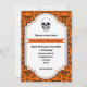 Skulls Damask Orange, schwarzes Muster & Banner Halloween Hochzeitseinladung. Dieses elegante Design zeichnet sich durch ein Damast-Blumenmuster und Schädelmuster, einen Rahmen in der Mitte, einen schwarzen Schädel und ein orangefarbenes Banner aus. Ein zeitgenössisches und dennoch elegantes Design mit zwei Schriftart: einem Vintagen und einem coolen. Elegantes, sprichwörtliches Design, perfekt für gotische oder Halloween Herbst/Herbst Hochzeiten. Es ist ein vollständig anpassbares Template und ist Teil eines Hochzeitsvortrags Set.