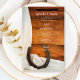 Customize the charming Horseshoe and Satin Country Western Wedding Menu with the details of the meal that you will serve at your bridal shower luncheon, rehearsal dinner or marriage reception by adding the salad or first course, entree or second course and dessert or third course. Personalize it with the names of the bride and groom, venue location and event date. This rustic chic custom equine theme wedding menu features a quaint photograph of a rusty horseshoe and white satin with a brown weathered barn wood background. Perfect for the couple who has planned a casual yet classy rural country farm, rustic barn, ranch, equestrian, horse or western wedding theme.