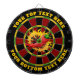 Dunkelrot, schwarz, grün und gelb gestrichene Tafel. Jede Farbe ist anpassbar. Heiße Pfeffer im Flammenkreis. Zwei benutzerdefinierte Textbereiche auf dem äußeren Ring.