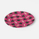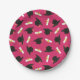 Graduation party paper plates printed with a hot pink pattern of graduation caps and diplomas with a yellow ribbon.