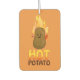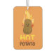 Vergnügen Cartoon braune Kartoffel mit einem großen glücklichen Lächeln, Punkte für Augen und Sticks für Arme. Er ist von heißen Flammen in Gelb und Orange umgeben. Unterhalb ihm in orange und gelb Text ist das Wort HOT und darunter, dass in braunem Text ist das Wort POTATO. Spaß beim Lachen.