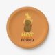 Niedliche braune Kartoffel mit Armaturen und einer großen Happy Fave umgeben von Flammen. Unten in gelben und orangefarbenen Buchstaben ist das Wort heiß, und darunter in braunen Buchstaben das Wort Potato.