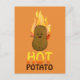 Vergnügen Cartoon braune Kartoffel mit einem großen glücklichen Lächeln, Punkte für Augen und Sticks für Arme. Er ist von heißen Flammen in Gelb und Orange umgeben. Unterhalb ihm in orange und gelb Text ist das Wort HOT und darunter, dass in braunem Text ist das Wort POTATO. Spaß beim Lachen.