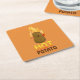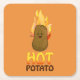 Vergnügen Cartoon braune Kartoffel mit einem großen glücklichen Lächeln, Punkte für Augen und Sticks für Arme. Er ist von heißen Flammen in Gelb und Orange umgeben. Unterhalb ihm in orange und gelb Text ist das Wort HOT und darunter, dass in braunem Text ist das Wort POTATO. Spaß beim Lachen.