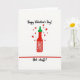 This Valentine's Day card features a hot sauce bottle in the center, with a bright red body and a green cap against a plain white background. Small red hearts float up and out from around the bottle, giving the scene a fun “spicy love” feel ❤️. The bottle label has a simple white starburst shape that stands out on the red bottle. At the top, the text says “Happy Valentine’s Day!” in black hand-drawn script, placed above the bottle. Near the bottom, a thin red line sits above the words “Hot stuff!” written in black, easy-to-read letters. The limited colors—red, green, black, and white—keep the message clear and focused 💌🍫.