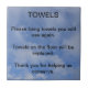Tucherhaltungszeichen für ein Hotel. Hängen Sie bitte Tücher, die Sie wieder benutzen. Tücher auf dem Boden werden ersetzt. Danke für das Helfen wir konservieren.