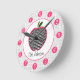 A clock for teachers featuring an illustration of a houndstooth apple Personalize with your name under apple. Clock features white numbers on pink dots.