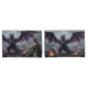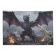 A large, dark purple dragon with massive wings faces a warrior in golden armor, who is holding a sword. The dragon is detailed with spikes and a menacing expression. The warrior is seen from the back, ready to fight. The ground is rocky and fiery, suggesting a volcanic or hellish landscape. The sky is overcast, adding to the dramatic atmosphere of the scene.